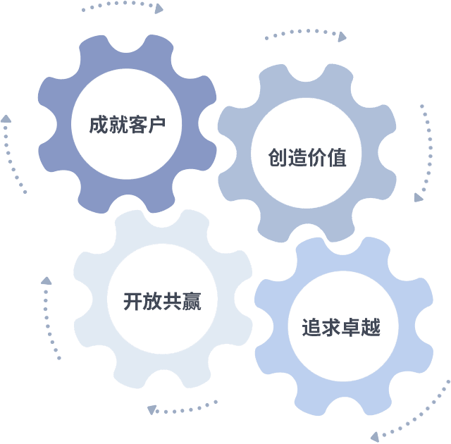 成就客户是一切决策的出发点,,,,创造价值是衡量所有工作的标准,,,,追求卓越是我们做事做人的态度,,开放共赢是我们的格局也是最终的结果。。价值观的齿轮环环相扣,,推动着组织里的每个人不断向前。。。