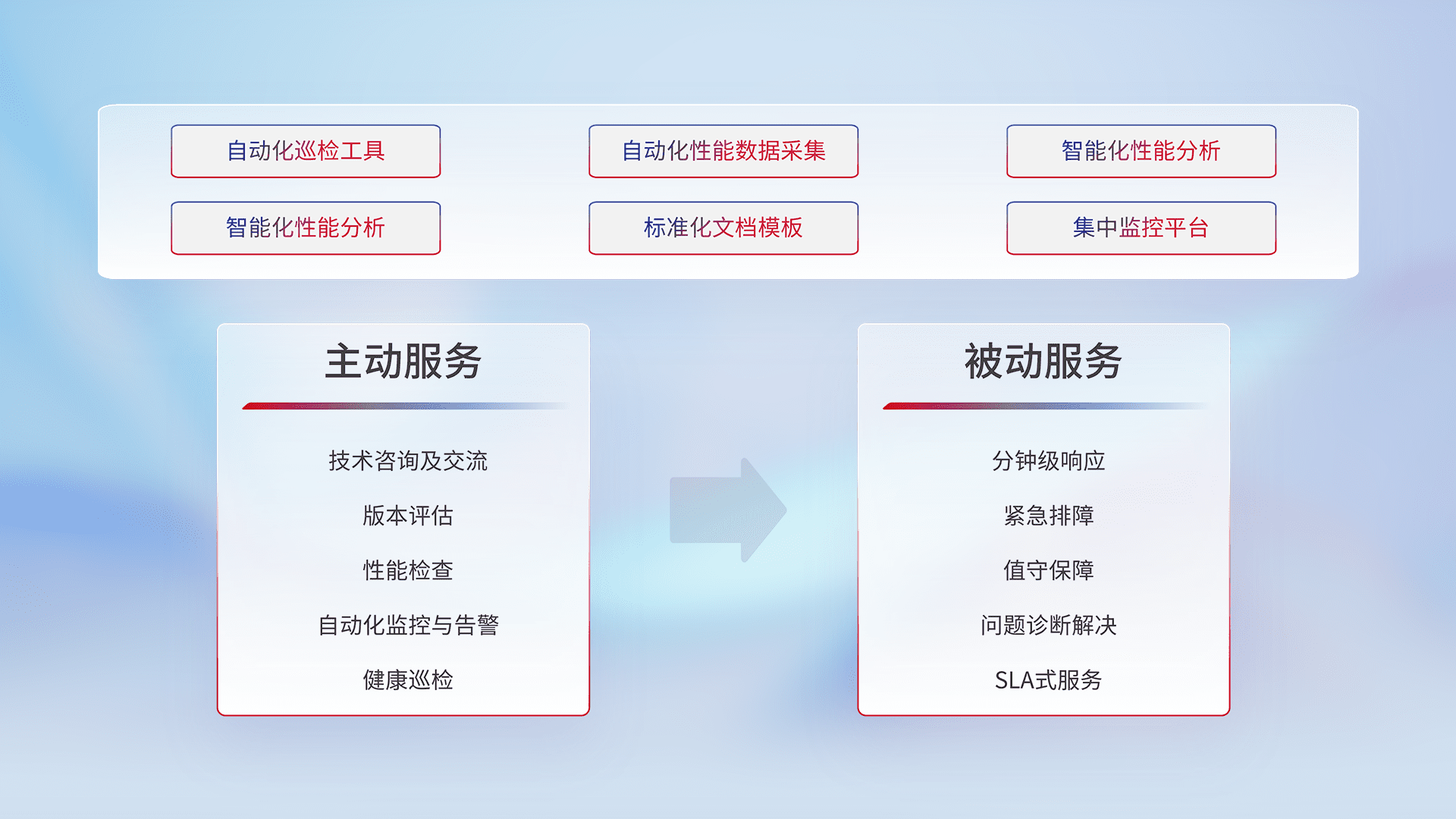 智能化工具和标准化文档,,,保障服务质量,,提供主动服务(包含技术咨询、、、版本评估、、性能检查、、、自动化监控与告警、、、、健康巡检)和被动服务包含(分钟级响应、、、、紧急排障、、、值守保障、、、、问题诊断解决、、SLA服务)。。。